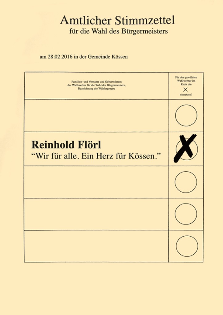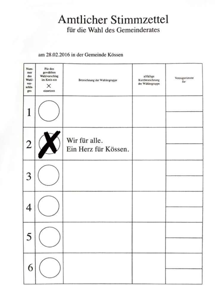 Am Sonntag, den 28. Februar 2016 fand in Kössen die Gemeinderatswahl statt. Wir bedanken uns bei 680 Wählern, das sind 27,62% der Stimmen, für das Vertrauen! Wir sind nun mit 5 Mandataren, davon 2 im Gemeindevorstand im Gemeinderat von Kössen vertreten und werden unser Bestes für unser Dorf geben! Vielen Dank an alle, die mitgeholfen haben, dieses gute Ergebnis zu erzielen!